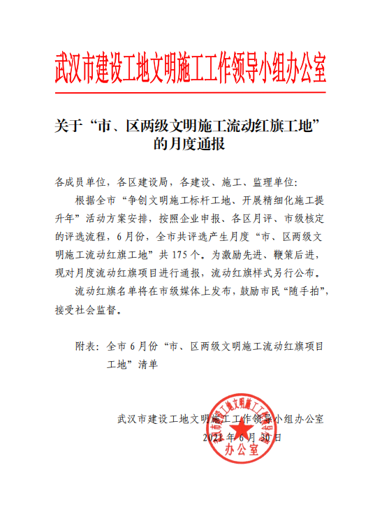 近日,武漢市建設(shè)工地文明施工工作領(lǐng)導(dǎo)小組辦公室發(fā)布了6月份關(guān)于“市、區(qū)兩級(jí)文明施工流動(dòng)紅旗工地”的月度通報(bào),漢陽(yáng)市政及分子公司的8個(gè)項(xiàng)目獲評(píng)“流動(dòng)紅旗工地”。