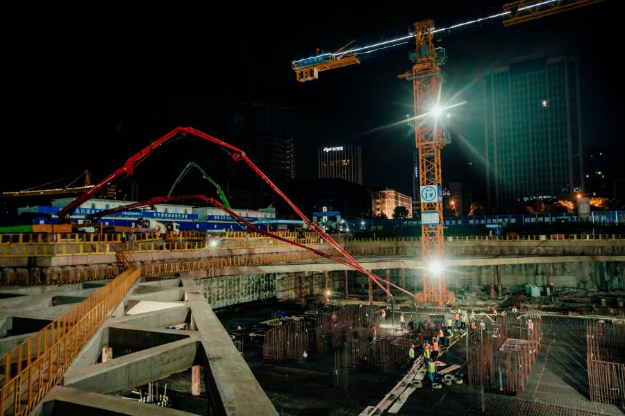凌晨,在中南科研設(shè)計(jì)中心項(xiàng)目的施工現(xiàn)場(chǎng),燈火通明,工人們正在有序工作。